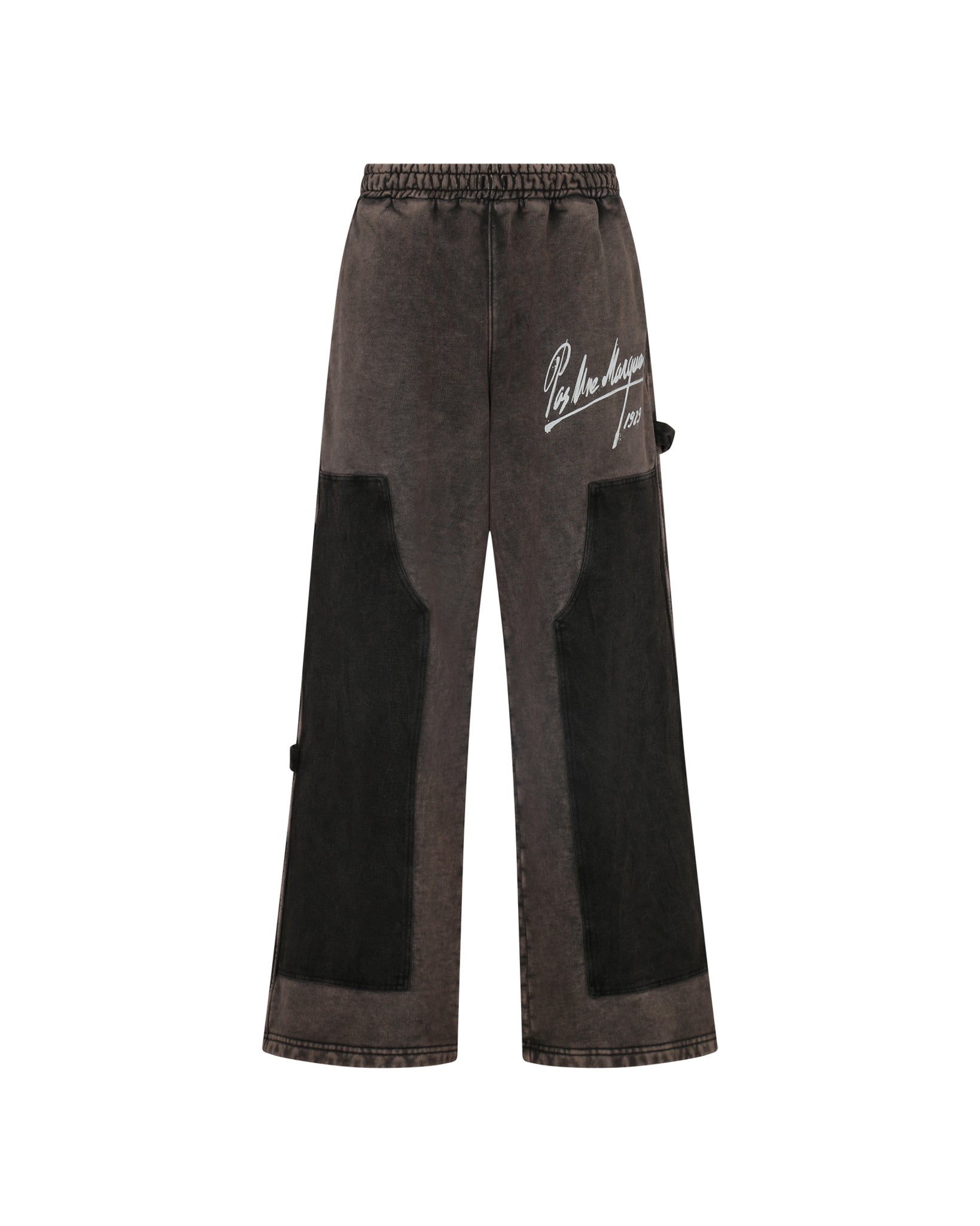Joggers with patches on the legs and patch pockets on the back made from denim. The garment has undergone a distressing process, giving it an aged appearance and distinctive character.