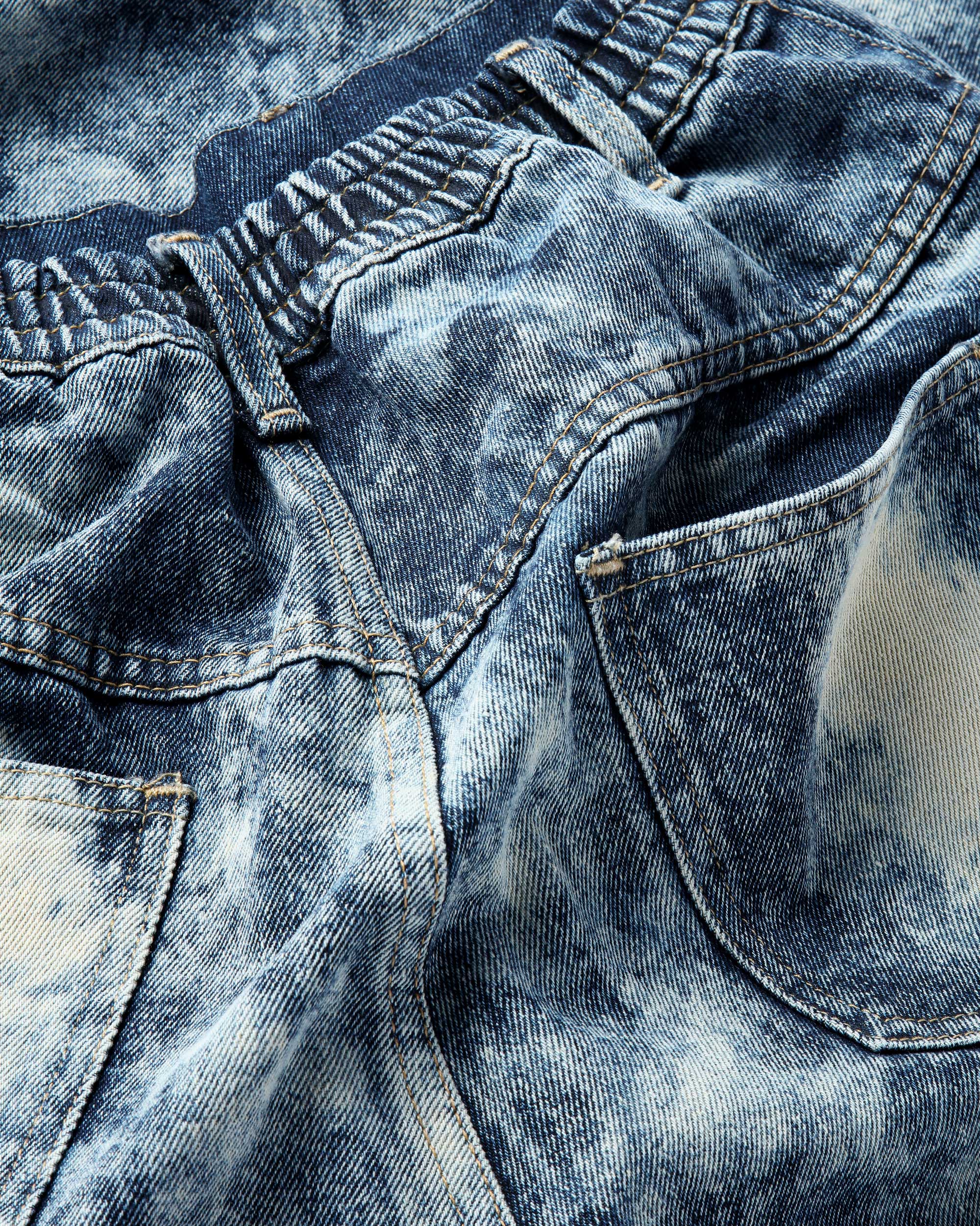 Straight-cut denim trousers with an elasticized back waistband for improved fit and comfort. Features a speckled wash effect along the entire leg.