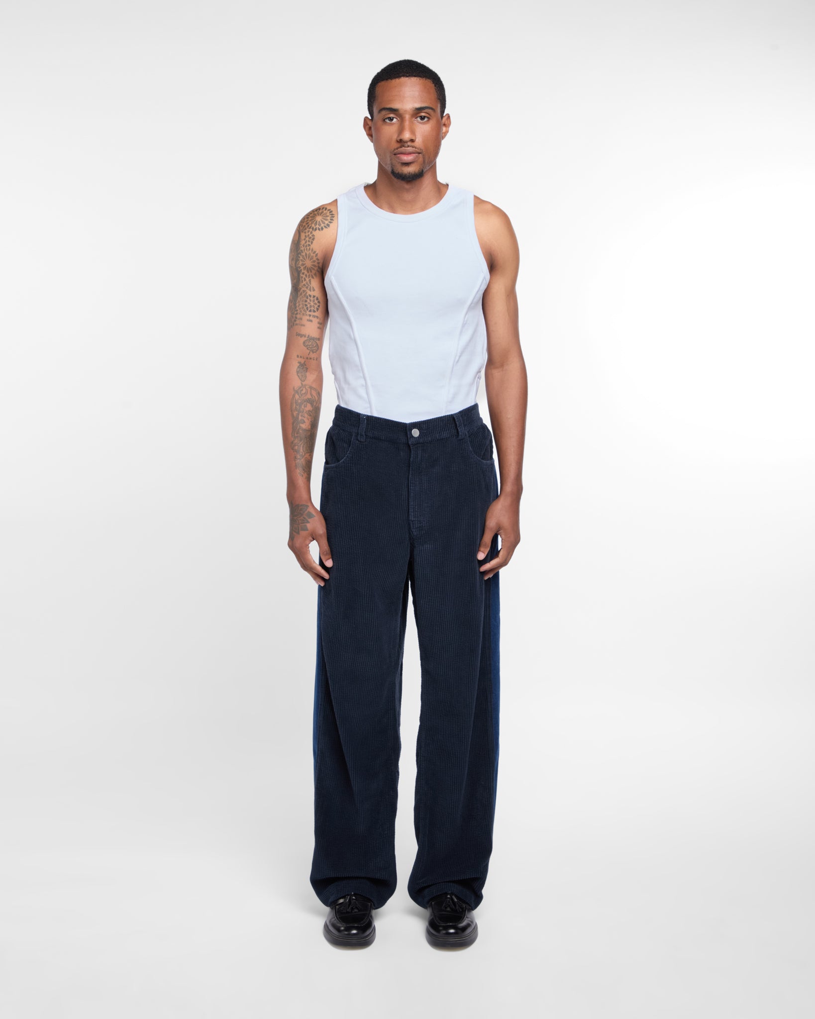 Blue corduroy trousers with overlapping denim side panel and elasticized back waistband for added comfort.