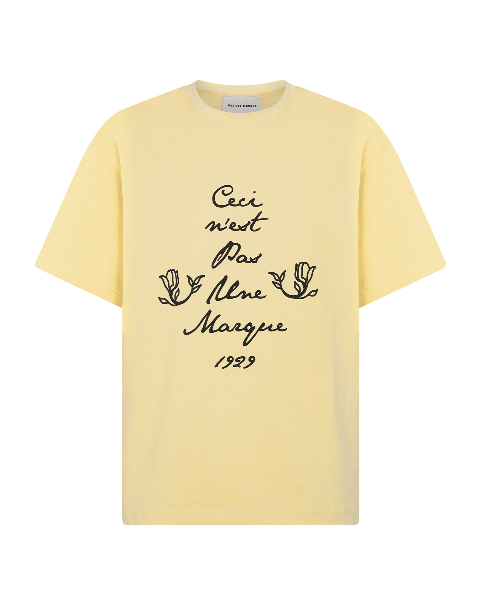 Introducing the signature tee shirt from Pas Une Marque, an iconic piece that seamlessly blends fashion with philosophy. This tee features the brand's slogan 'Ceci N’est Pas Une Marque,' a clever allusion to René Magritte’s famous painting "The Treachery of Images." This slogan serves as a foundational element of the brand's identity, encapsulating its philosophical approach and the interplay between art and fashion.