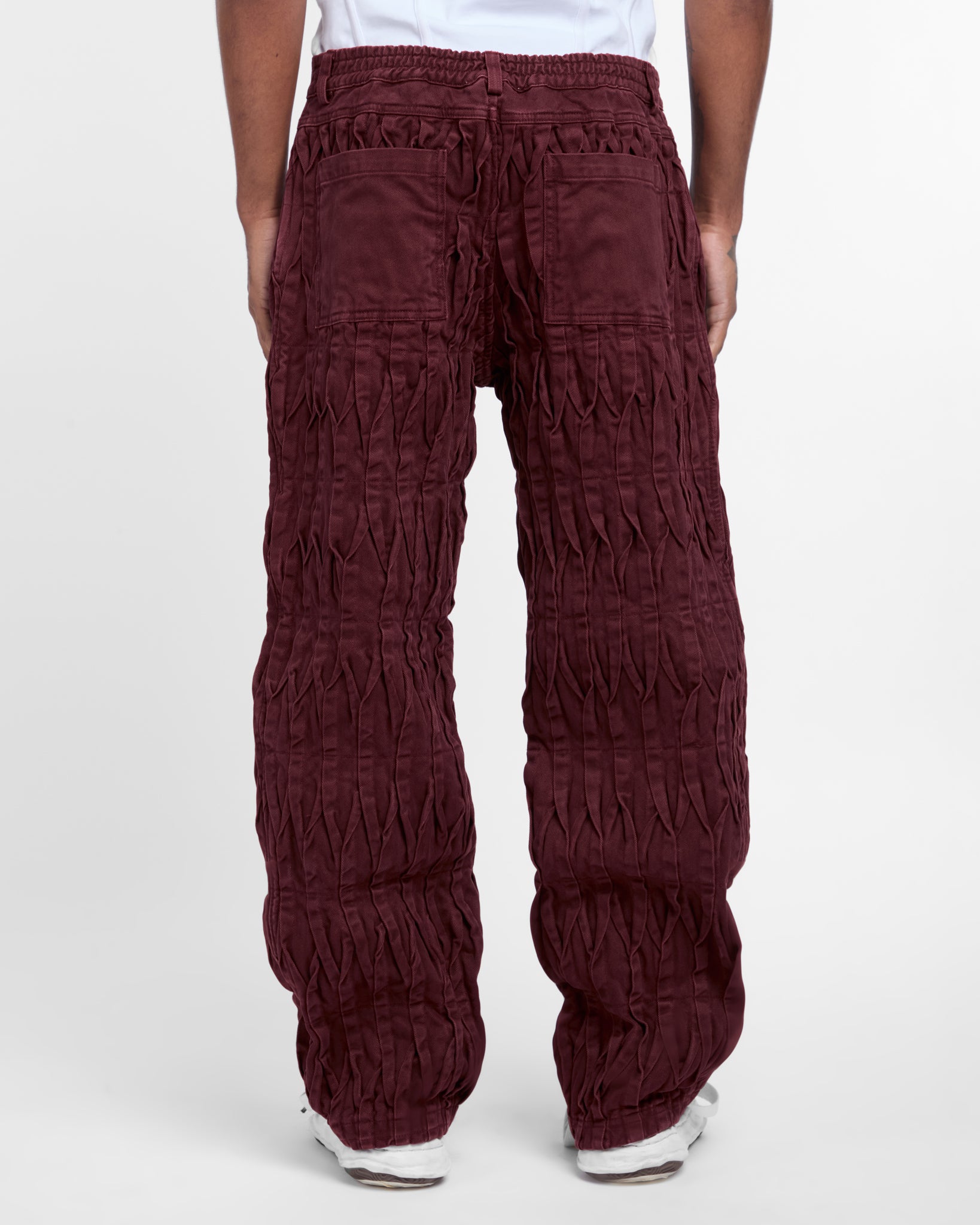 12 oz bull denim pants in a deep burgundy tone. The garment features pintuck detailing along the entire length of the leg, creating a textured surface.