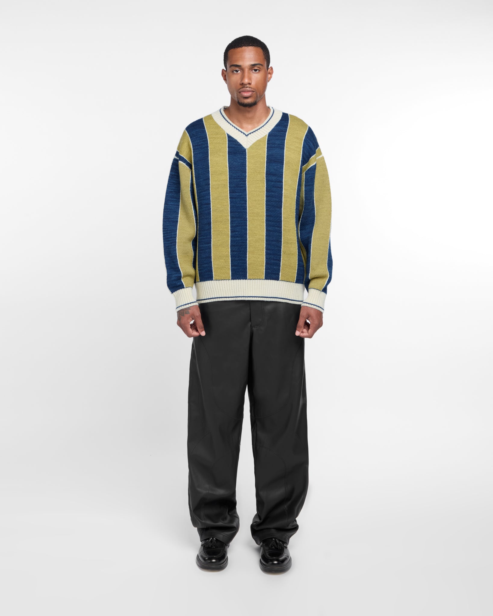 Knitted V-neck sweater with vertical stripe design, made from merino wool and baby suri alpaca, providing softness.