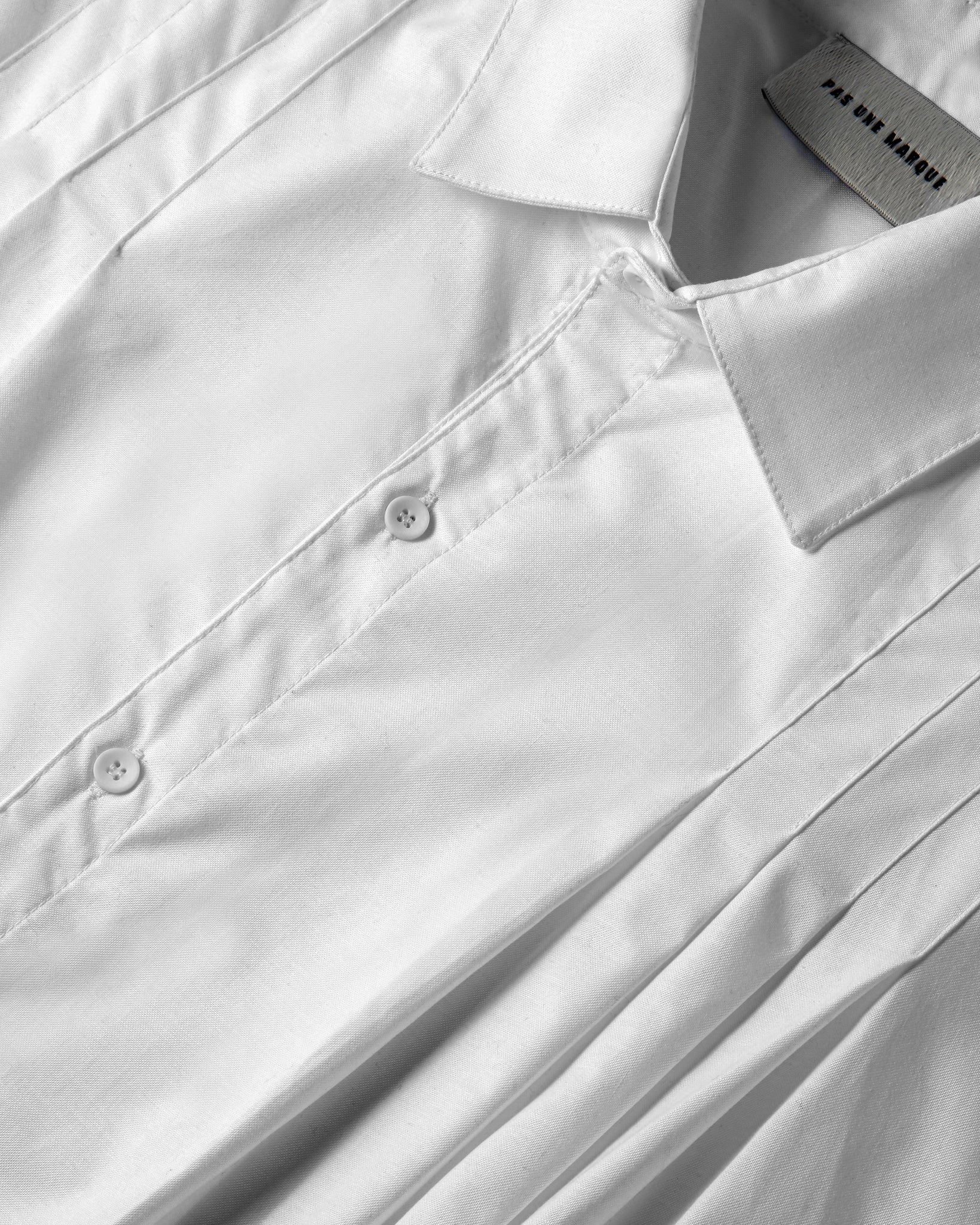 White cotton shirt, oversized fit, with four pleats on each shoulder for structure and visual detail.