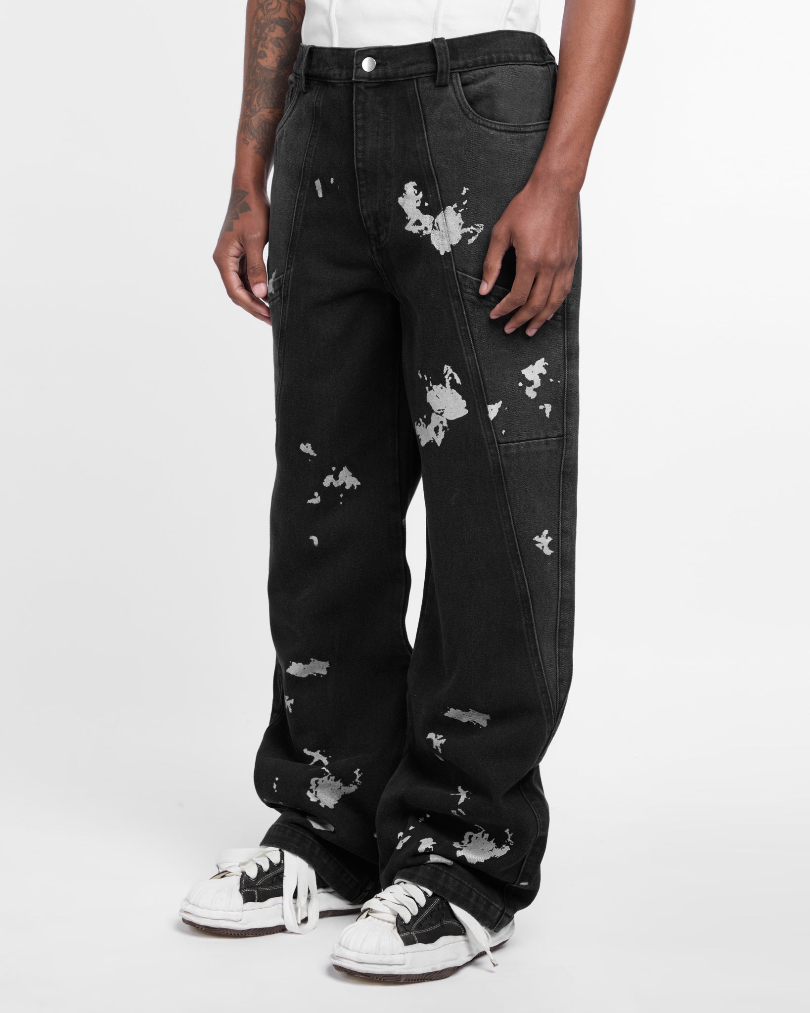 Two-tone black denim trousers with foil splatter details across the entire garment.