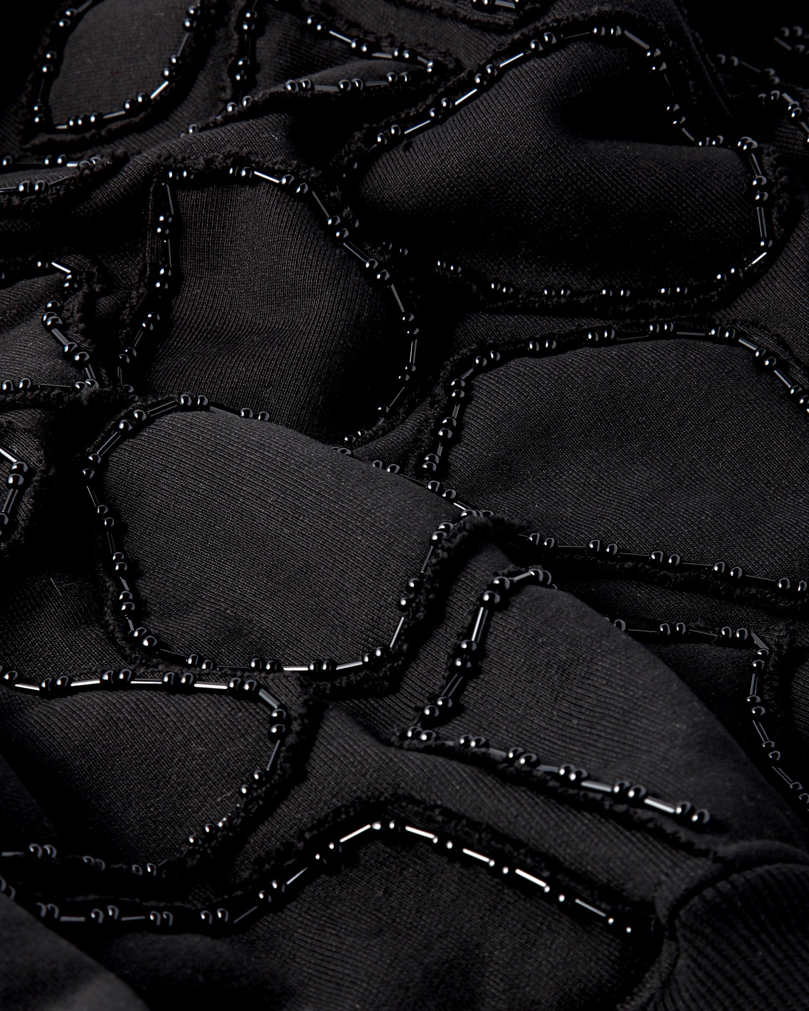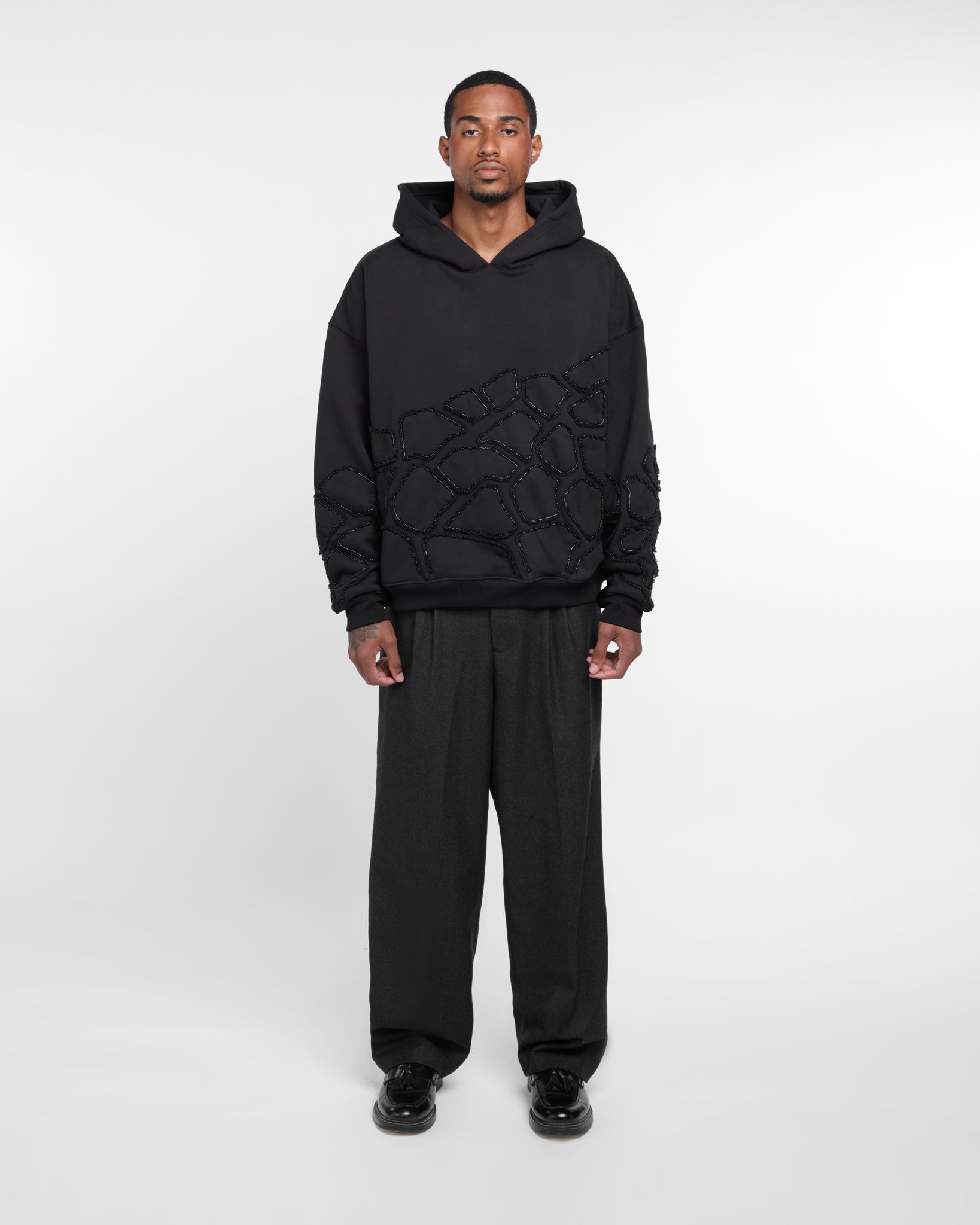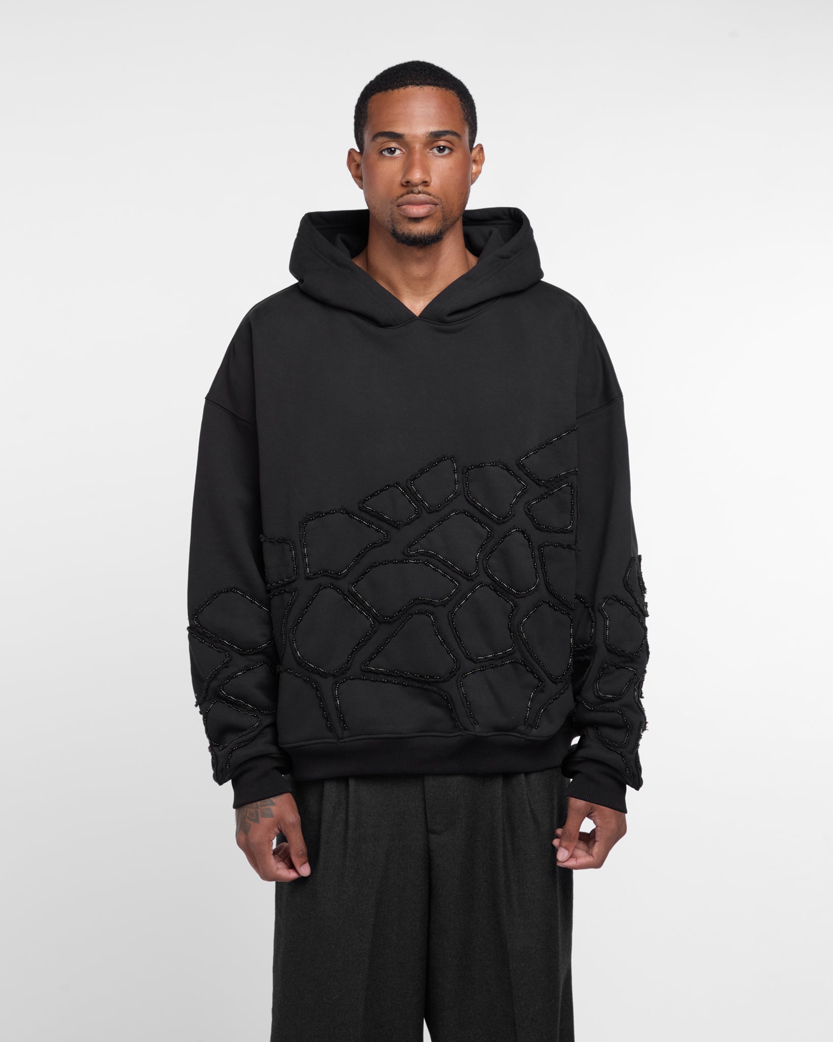 Black French Terry hoodie with appliqués of French Terry pieces embellished with rhinestones, forming a pattern on the sleeves and hem of the garment.