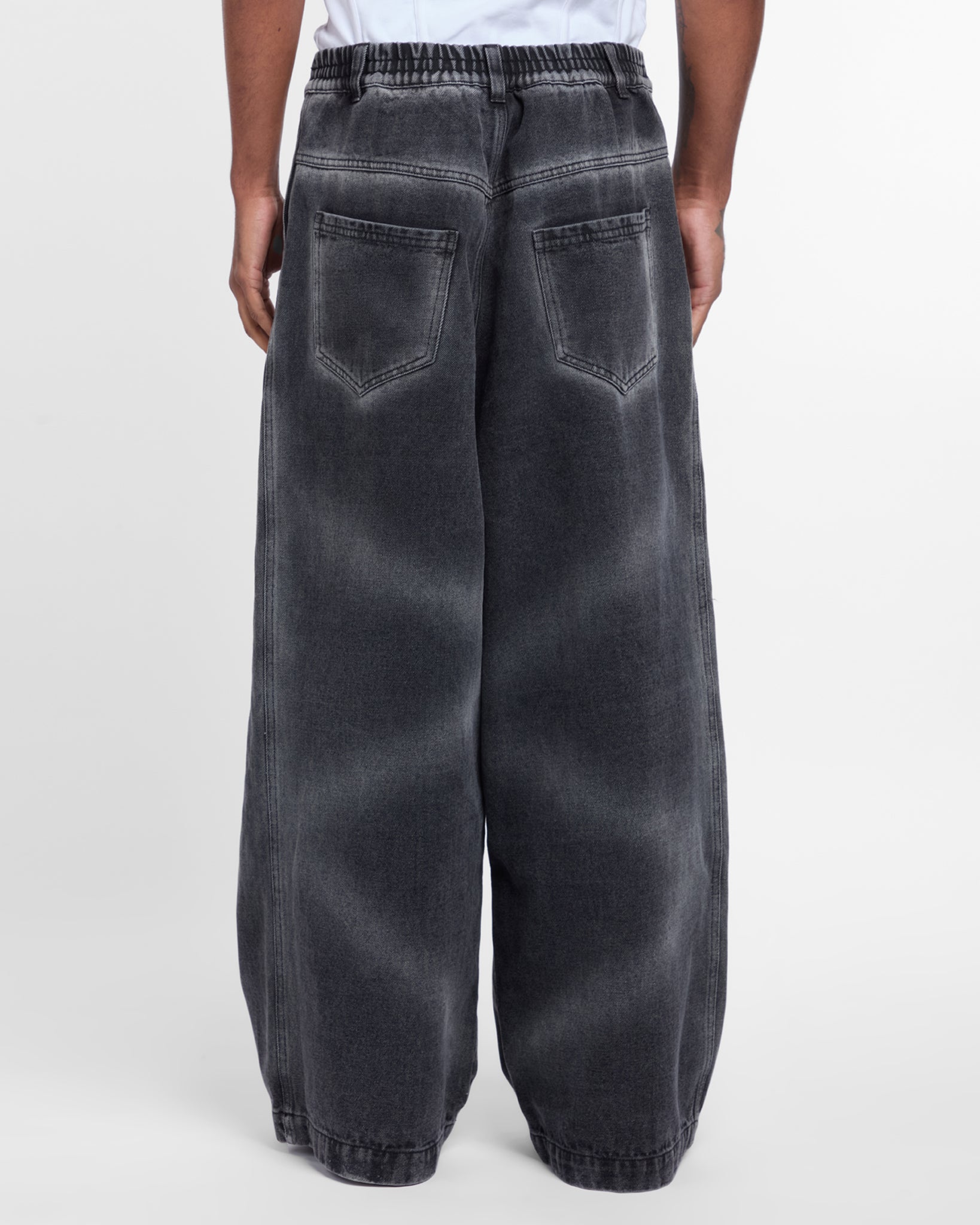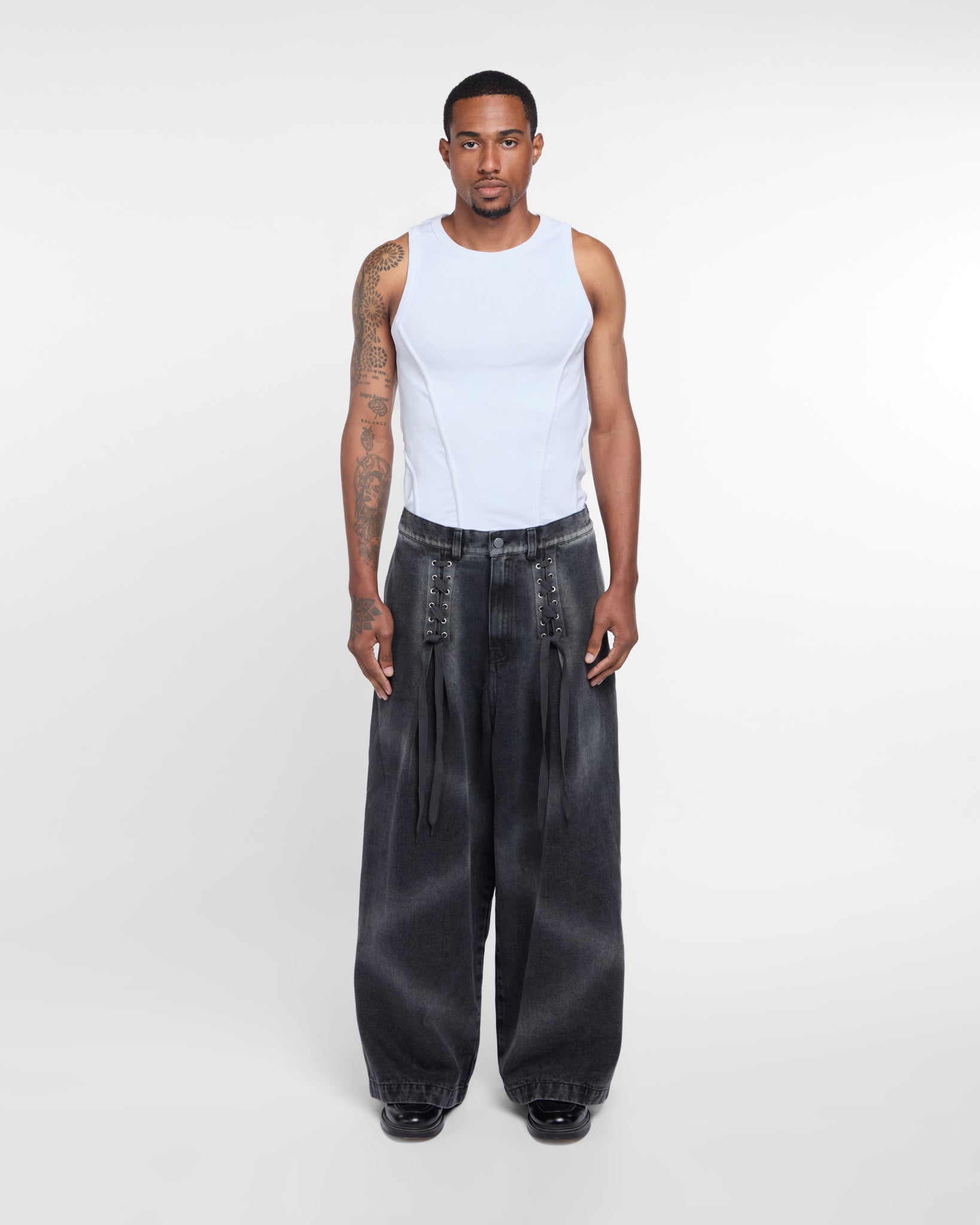 Black wide-leg trousers with metal eyelets and front drawstrings.